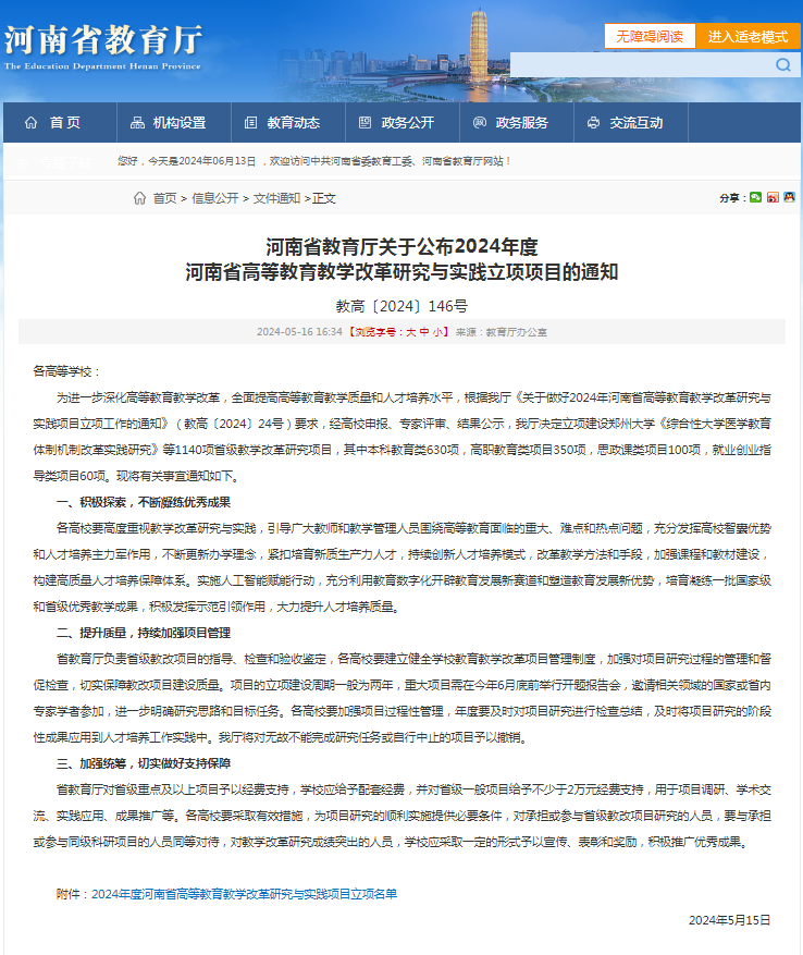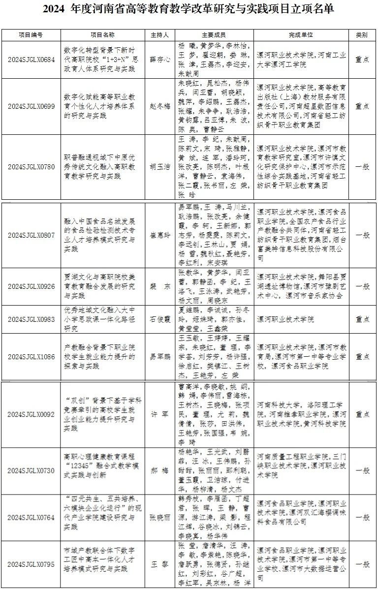 近日,河南省教育厅办公室发布了《关于公布2024年度河南省高等教育教学改革研究与实践立项项目的通知》(教高〔2024〕146号),漯河职业技术学院11个项目获批立项,其中主持7项(高等职业教育类5项,高校就业创业类1项,思政课类1项)、参与4项。